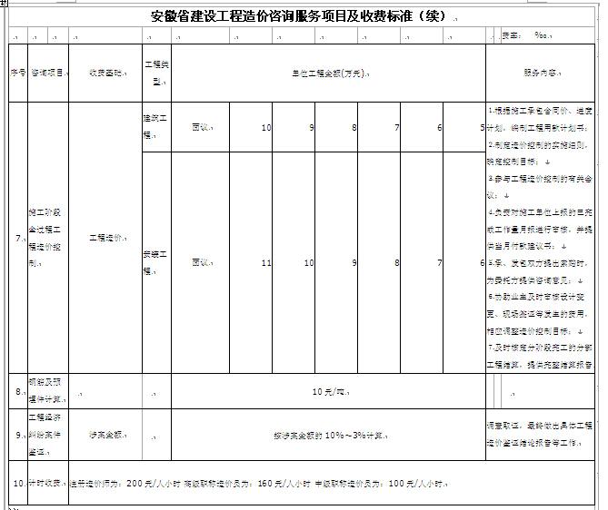 ???? 九、建設(shè)工程造價咨詢服務(wù)單位收費,須到當(dāng)?shù)匚飪r部門辦理換發(fā)《安徽省經(jīng)營性服務(wù)許可證》,在其經(jīng)營場所、交費地點的醒目位置公示收費項目、服務(wù)內(nèi)容、計費方式、收費標(biāo)準(zhǔn)等事項,自覺接受社會監(jiān)督和價格部門的監(jiān)督檢查。