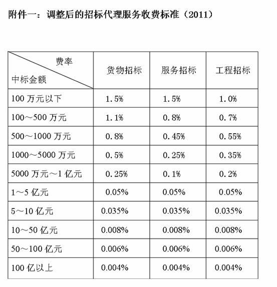 ??? 四、降低中標(biāo)金額在5億元以上招標(biāo)代理服務(wù)收費(fèi)標(biāo)準(zhǔn),并設(shè)置收費(fèi)上限。貨物、服務(wù)、工程招標(biāo)代理服務(wù)收費(fèi)差額費(fèi)率:中標(biāo)金額在5—10億元的為0.035%;10—50億元的為0.008%;50—100億元為0.006%;100億元以上為0.004%。貨物、服務(wù)、工程一次招標(biāo)(完成一次招標(biāo)投標(biāo)全流程)代理服務(wù)費(fèi)最高限額分別為350萬元、300萬元和450萬元,并按各標(biāo)段中標(biāo)金額比例計(jì)算各標(biāo)段招標(biāo)代理服務(wù)費(fèi)。